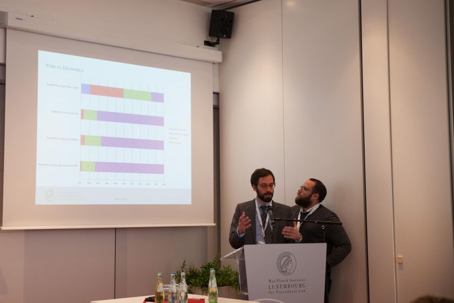 The conference was opened by a welcome address of the Director of the Institute, Prof. Dr. Dres. h.c. Burkhard Hess, who underlined the central role of the Library in the research process, and the importance of its services for the success of the Institute. In her keynote opening address the Head of the Library, Ms. Juja Chakarova, outlined the impressive evolution of technological developments, and their impact on the libraries of today and of the future. The researcher’s perspectives on library services were presented by Dr. Edouard Fromageau and Dr. Pietro Ortolani, two senior researchers of the Institute. The presentation was considered thought-provoking.